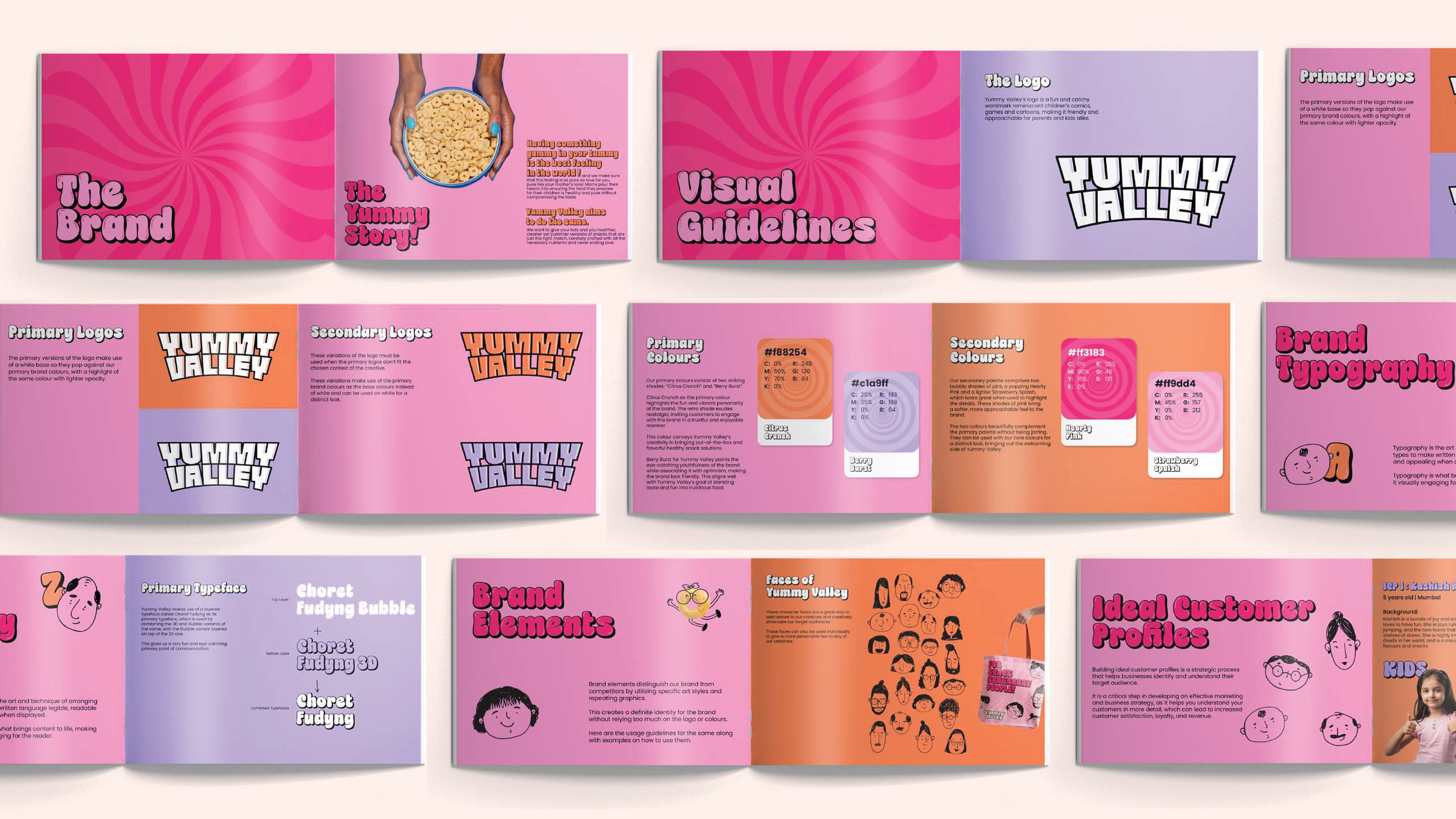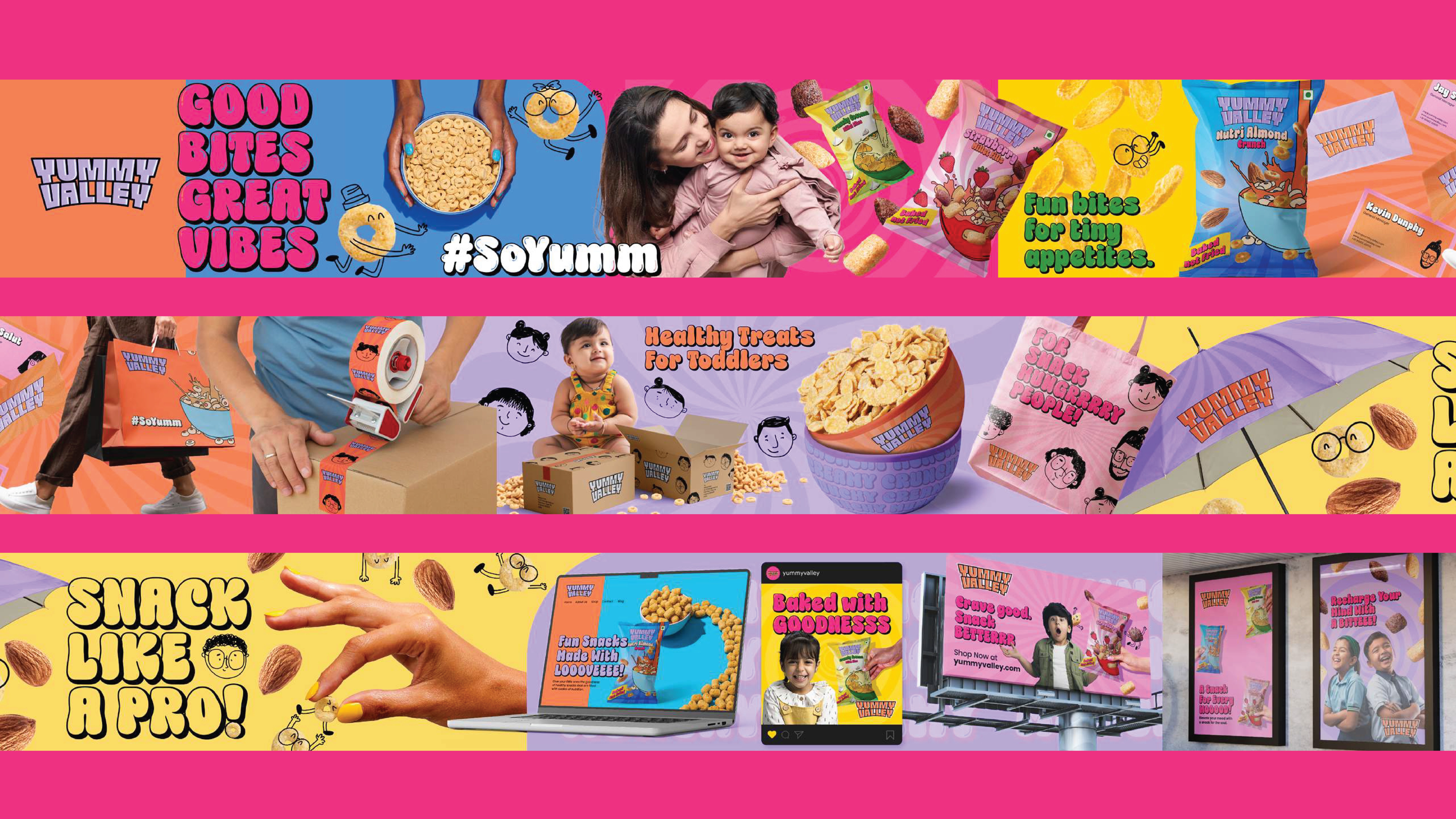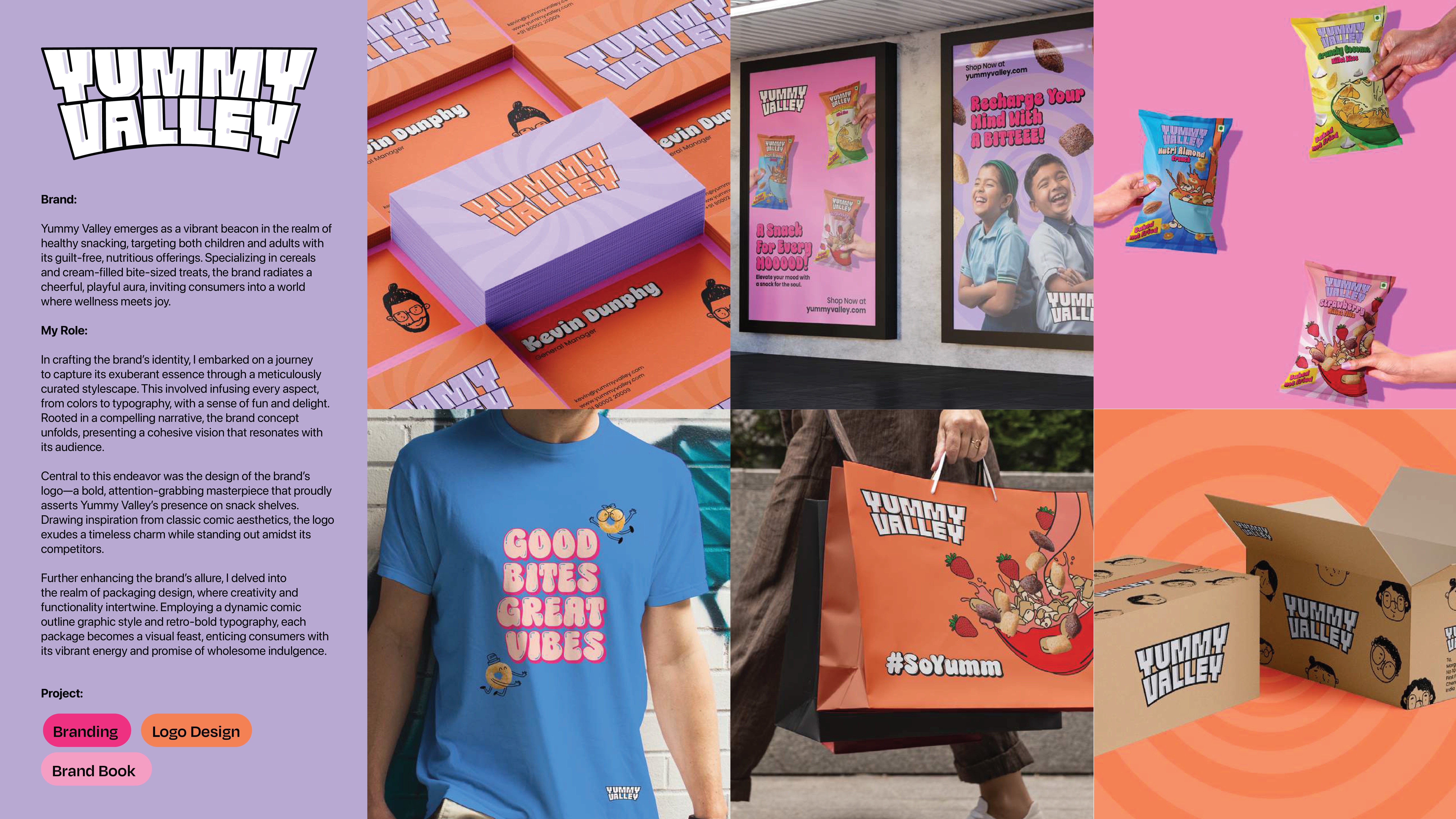 The Challenge Yummy Valley set out to make healthy snacking fun for both kids and adults — but the challenge was clear: how do you position a guilt-free cereal and cream-filled snack in a market filled with loud, colorful competitors, without losing the brand’s own cheerful and wholesome essence? My Role I led the brand identity design, with a focus on building a visual language that balanced wellness and playfulness. My goal was to create a brand system that not only stood out on the shelves but also built instant recognition and trust with health-conscious families. The Process Stylescape Development: Built a visual foundation that captured the brand’s joyful, comic-inspired energy through bold colors, playful typography, and vibrant graphics. Logo Design: Designed a striking logo inspired by classic comic aesthetics, ensuring it communicated fun, boldness, and timeless charm while carving space for Yummy Valley in a crowded snack aisle. Packaging Design: Translated the identity into packaging that combined retro-bold type and comic outlines, creating packs that felt both nostalgic and modern, playful yet premium. The Outcome The result was a cohesive brand identity and packaging system that made Yummy Valley instantly eye-catching and memorable, delivering on the promise of snacks that are both healthy and joyful.